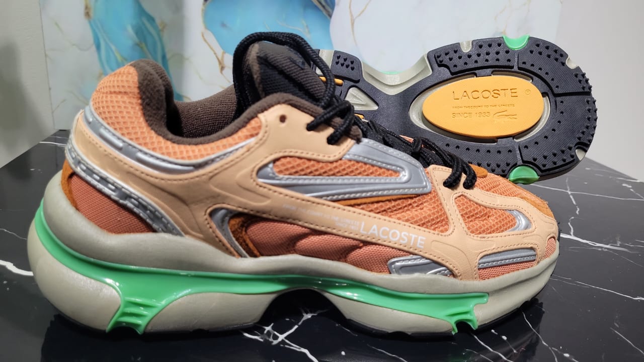 Las Lacoste L003 2K24 fusionan moda y rendimiento en un diseño inspirado en el running de alto nivel. Con una combinación de colores naranja y verde, estas zapatillas destacan por su estética deportiva contemporánea y su estructura híbrida. La parte superior de malla transpirable con refuerzos sintéticos garantiza ligereza, mientras la suela texturizada con tacos antideslizantes ofrece estabilidad y agarre.