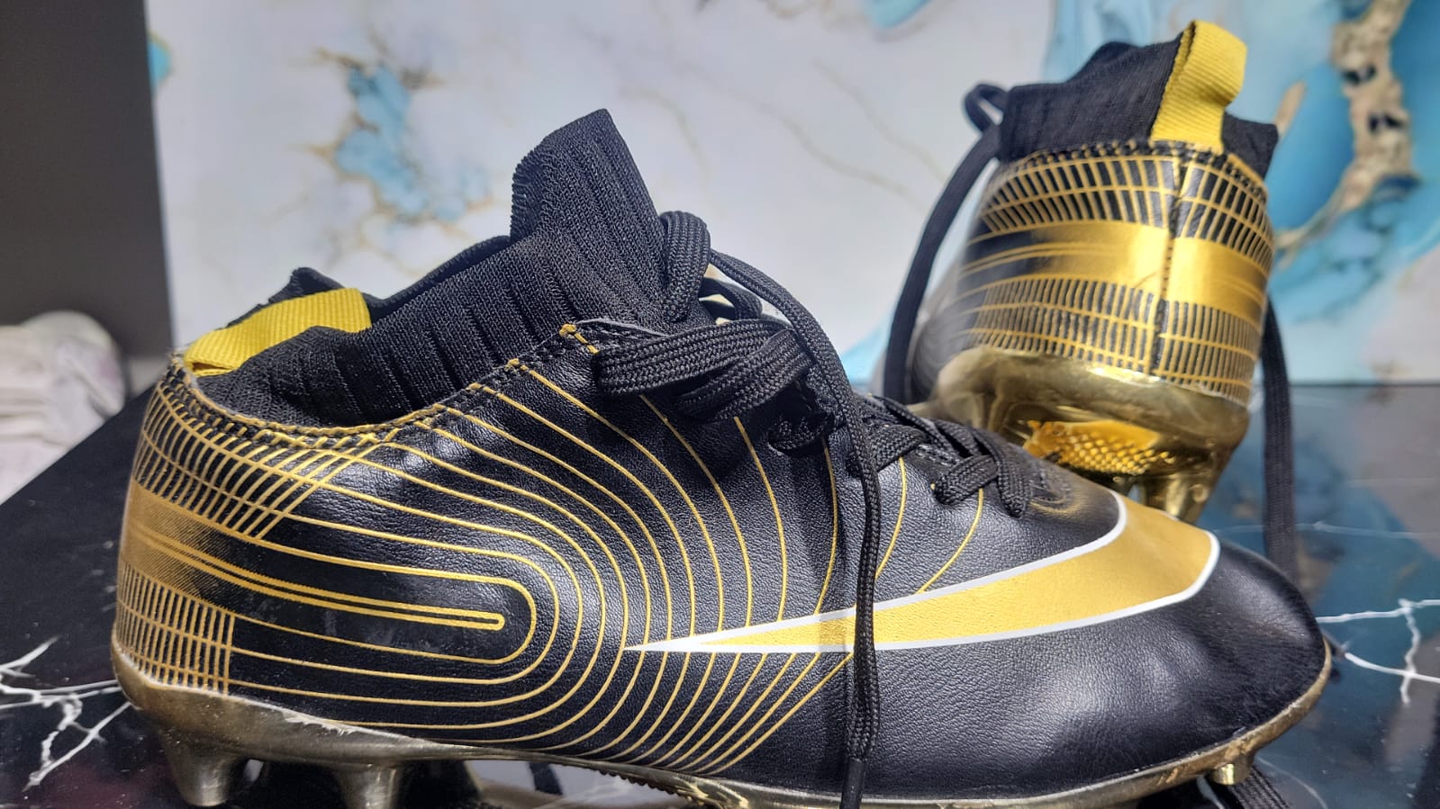 Diseñados para dominar el campo, estos tacos combinan un exterior de piel sintética suave con un ajuste de tobillo alto para máximo soporte. La suela de TPU chapada en Dorado oro es antideslizante y ofrece tracción explosiva en césped natural o artificial.