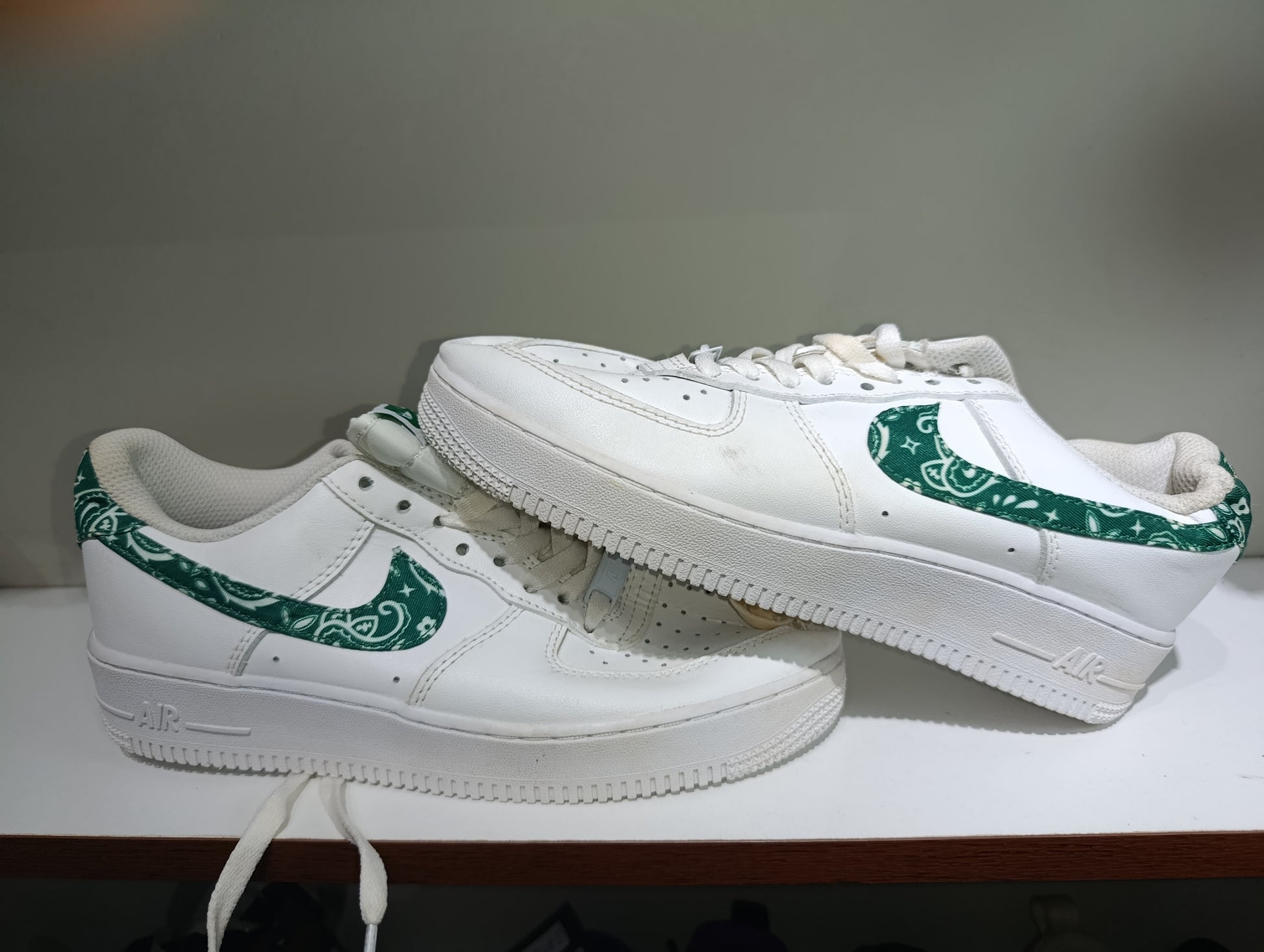 Las Nike Air Force 1 Low '07 Essential "Green Paisley" fusionan el icónico legado de Nike con un toque de frescura moderna. Su estética en tonos vela (blanco), con detalles en verde malaquita y elementos de bandana, evoca un estilo audaz y veraniego.