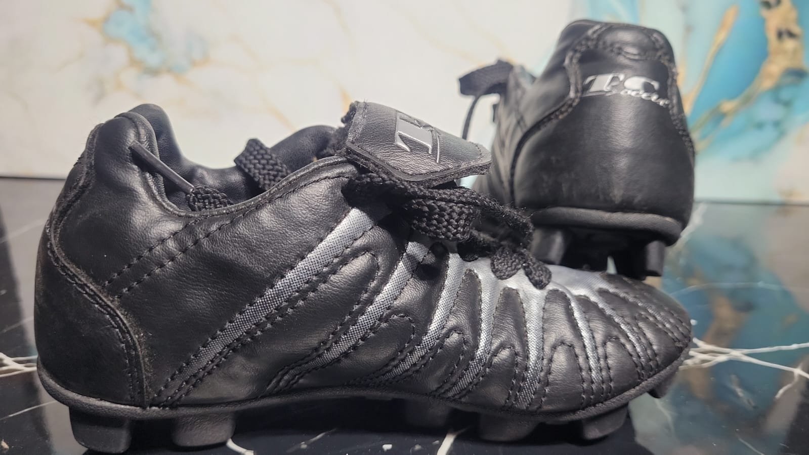 Botines TC Soccer negros de estilo clásico. El diseño combina un aspecto tradicional con un rendimiento óptimo en superficies firmes (FG/MG). La parte superior sintética y la suela con tacos moldeados proporcionan durabilidad y tracción versátil. Cierre de cordones con solapa de velcro para un ajuste seguro.